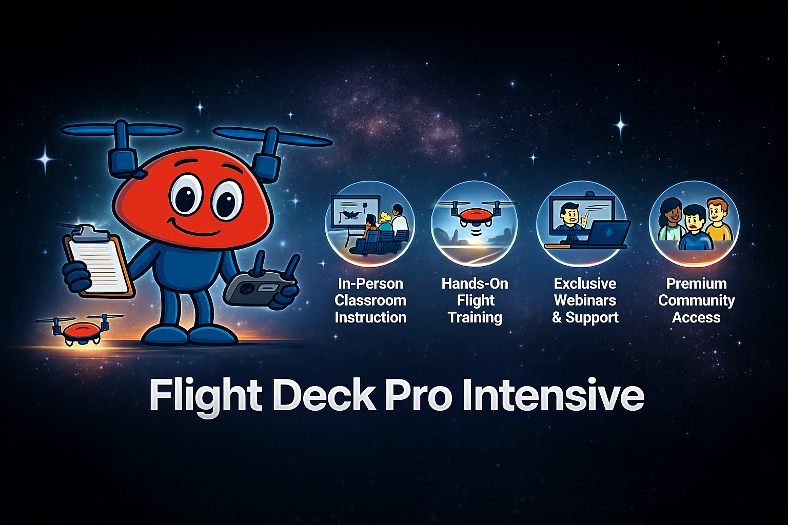 Flight Deck Pro Intensive is our immersive, in-person FAA Part 107 training experience. Designed for beginners and aspiring professionals, this program combines classroom instruction with real flight operationsâproviding hands-on experience, technical skills, and expert guidance throughout your certification journey.